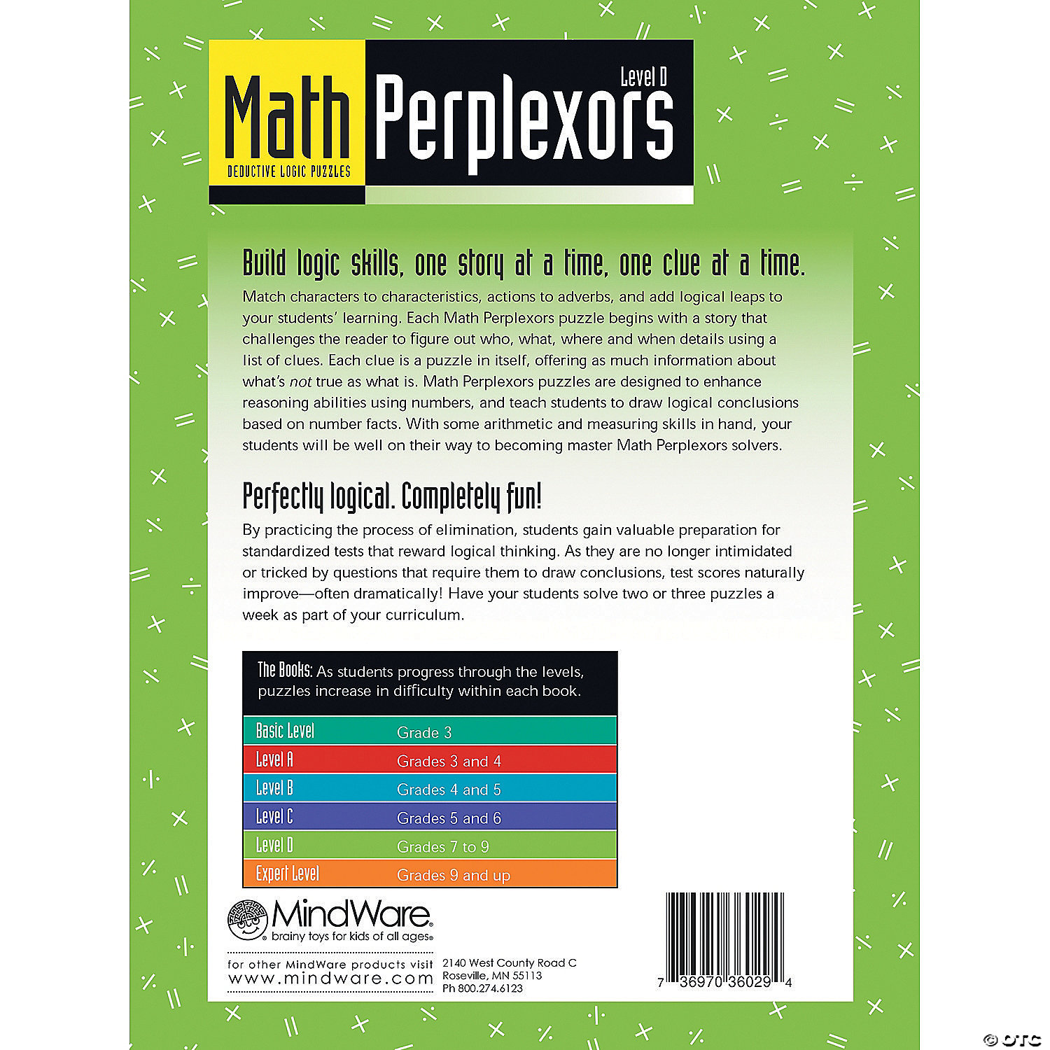 Puzzle solvers will love these entertaining story problems that require deductive reasoning, logical elimination and math skills. Using clues, cross off words in a list of all possible answers to arrive at the solution. The Math Perplexors: Level D (Ages 12 and up) has 50 problems which increase in complexity as you work your way through the book. This book is reproducible for single-classroom use. Please click the link below for a free printable worksheet sample. Download Sample Page